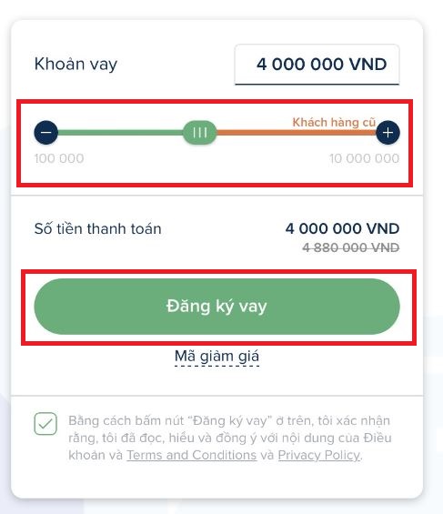 Bước 1: Sau khi mở App, bạn sẽ thấy giao diện như hình. Kéo thanh trượt để lựa chọn số tiền vay và kỳ hạn vay.