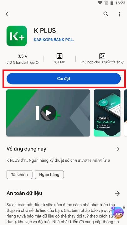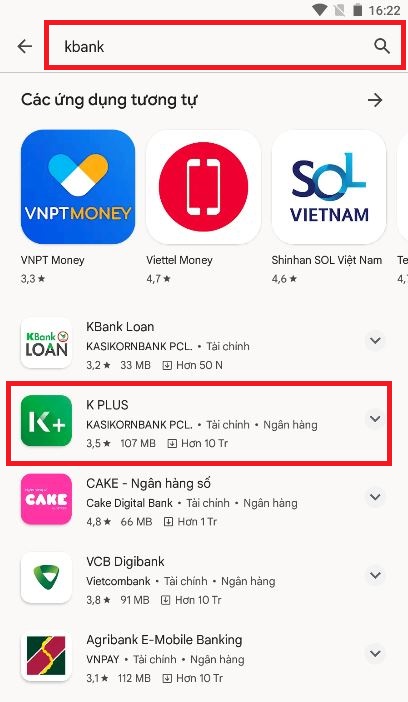 Bước 3: Trang tìm kiếm hiện ra, bạn lựa chọn App KBank và nhấn vào nút Cài Đặt để App tải về và cài đặt tự động.