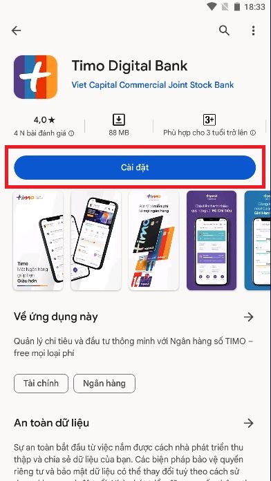 Bước 3: Lựa chọn App Timo và nhấn vào nút Cài Đặt. App sẽ tự động được tải về và chạy cài đặt.