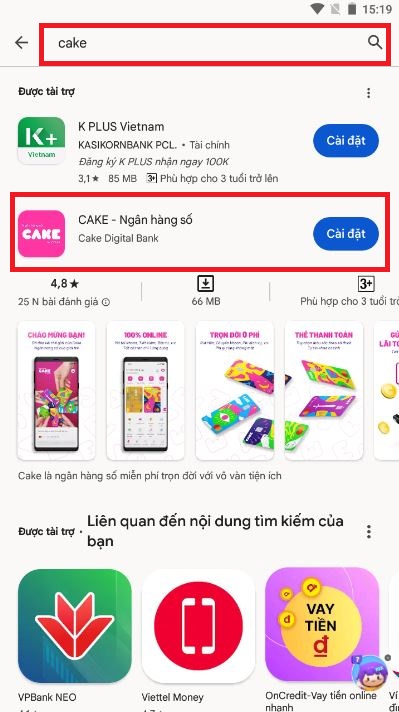 Bước 3: Ở trang tìm kiếm, lựa chọn App Cake. Nhấn vào nút Cài Đặt để tải về App và cài đặt tự động.