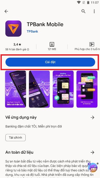 Bước 3: Lựa chọn App TP Bank và nhấn vào nút cài đặt. App sẽ được tải về và cài đặt tự động.